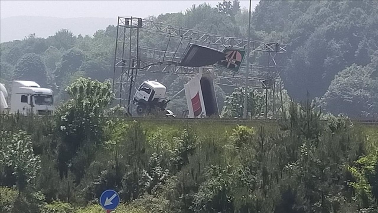 Kazada açık kalan damperi levha direklerine takılan kamyonun ön kısmının havada asılı kaldığı görüldü. Bölgeye çağrılan vinç yardımıyla kamyon takıldığı yerden çıkarıldı.