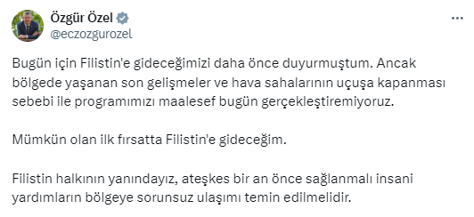 Sosyal medya hesabından yaptığı açıklamada Özgür Özel, "Bugün için Filistin'e gideceğimizi daha önce duyurmuştum. Ancak bölgede yaşanan son gelişmeler ve hava sahalarının uçuşa kapanması sebebi ile programımızı maalesef bugün gerçekleştiremiyoruz" dedi.