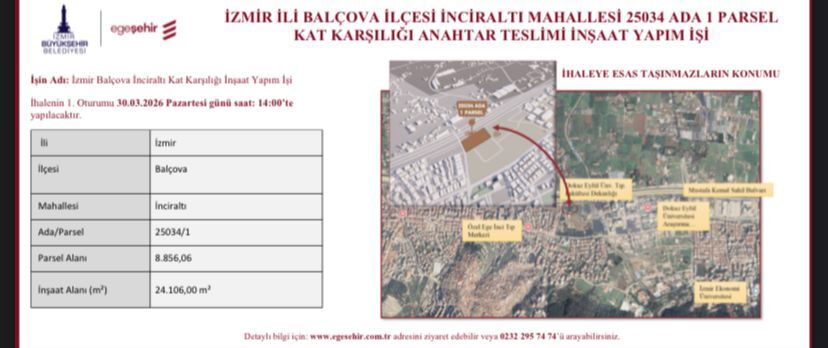 Son Mühür- İzmir Büyükşehir Belediyesi’ne bağlı Egeşehir Yapı Planlama Müşavirlik ve Teknoloji A.Ş., Balçova’da uzun süredir kamuoyunda tartışılan bir taşınmaz için kat karşılığı inşaat ihalesi düzenleme kararı aldı. Balçova Belediyesi ile ortak mülkiyete sahip olan taşınmaz üzerinde gerçekleştirilecek anahtar teslim projenin ihalesinin 30 Mart’ta yapılacağı duyuruldu.