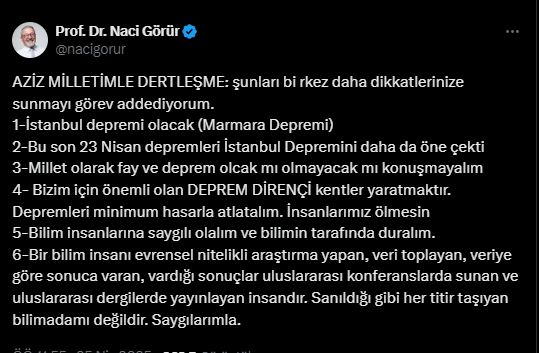 Son Muhabir/Merve Turan- İstanbul Silivri açıklarında meydana gelen 6.2 büyüklüğündeki depremin ardından gözler bir kez daha uzmanlara çevrildi. Deprem sonrası açıklamalarda bulunan yer bilimci Prof. Dr. Naci Görür, sosyal medya platformu X üzerinden yaptığı paylaşımda, “Aziz milletimle dertleşme” başlığıyla 6 maddelik bir değerlendirme yayımladı. Görür, İstanbul’da beklenen Marmara Depremi'ne dikkat çekerken, bilimsel yaklaşımların önemine vurgu yaptı.