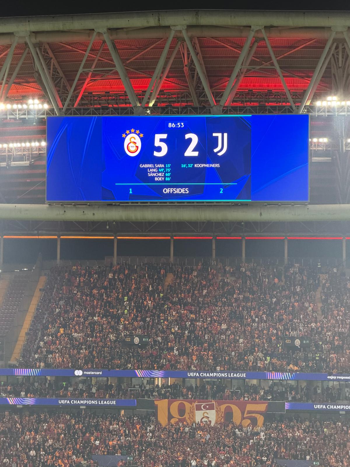 Karşılaşmanın geri kalan dakikalarında topun ve oyunun kontrolünü tamamen elinde tutan Galatasaray, İtalyan temsilcisine geri dönüş şansı tanımadı. 5-2’lik net skorla sahadan galip ayrılan Galatasaray, bu sonuçla son 16 turu kapısını ardına kadar araladı. Maç bitiminde 50 bin taraftarıyla zaferi kutlayan sarı-kırmızılılar, sergiledikleri bu üstün performansla hem Türkiye’ye büyük bir gurur yaşattı hem de Juventus’a karşı kulüp tarihinin en unutulmaz galibiyetlerinden birini hanesine yazdırdı.