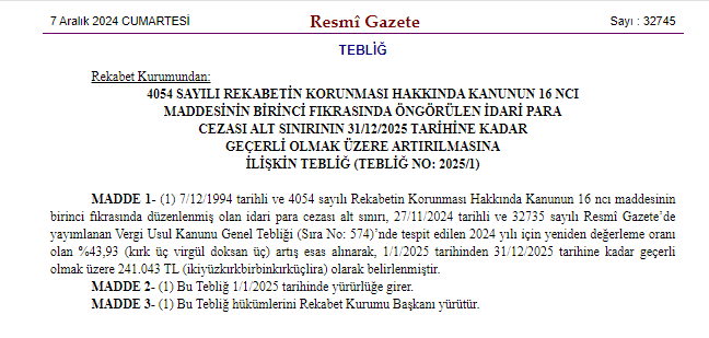 Rekabet Kurumu tarafından hazırlanan "4054 sayılı rekabetin korunması hakkında kanunun 16'ncı maddesinin birinci fıkrasında öngörülen idari para cezası alt sınırının 31 Aralık 2025 tarihine kadar geçerli olmak üzere artırılmasına ilişkin tebliğ" Resmi Gazete'de yayımlandı.
