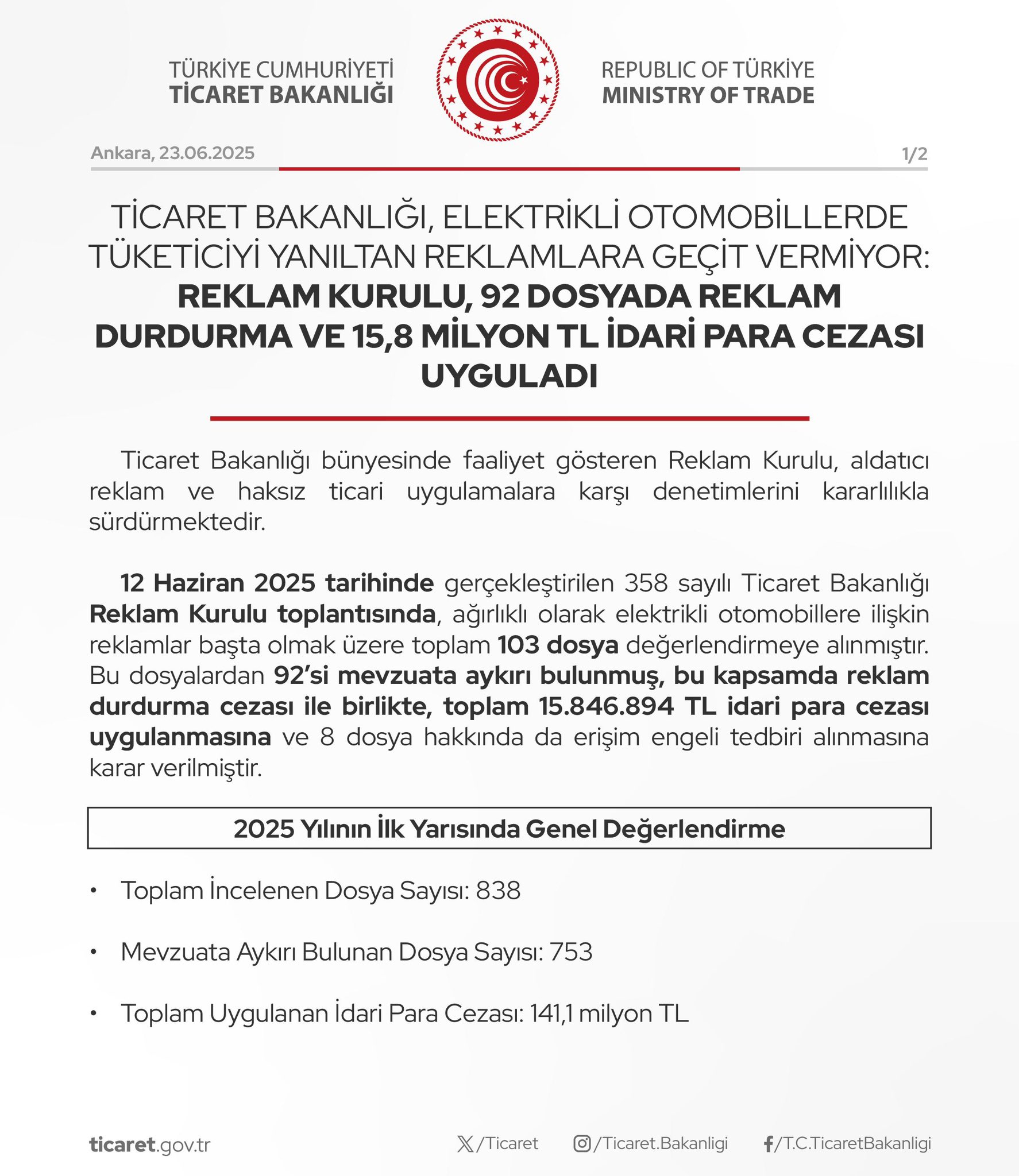 Yılın ilk altı ayı içerisinde Reklam Kurulu’nun değerlendirmeye aldığı toplam dosya sayısı 838 oldu. Bu dosyaların 753’ünde mevzuata aykırılık tespit edilirken, yıl başından bu yana uygulanan toplam idari para cezası 141,1 milyon TL’ye ulaştı.