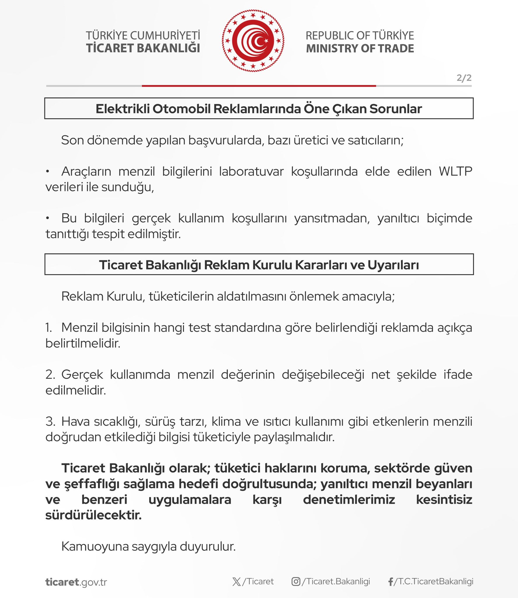 Ticaret Bakanlığı’ndan yapılan açıklamada, “Tüketici haklarını korumak, sektörde güven ve şeffaflığı sağlamak amacıyla denetimlerimiz aralıksız sürecektir. Yanıltıcı menzil beyanları ve benzeri uygulamalara karşı gerekli tüm idari işlemler kararlılıkla yürütülecektir” ifadelerine yer verildi.
