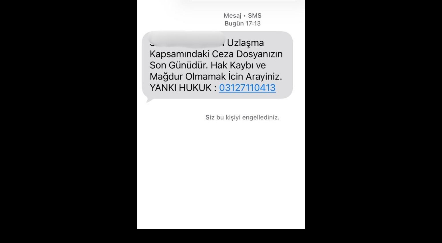 “Yankı Hukuk” adıyla farklı GSM operatörleri ve sabit hatlar üzerinden birçok vatandaşa haklarında uzlaşma kapsamında ceza dosyası bulunduğu ve ceza dosyasının son günü olduğu, mağduriyet yaşamamak için kendileriyle irtibata geçilmesini içeren mesajlar gönderilmeye başlandı.