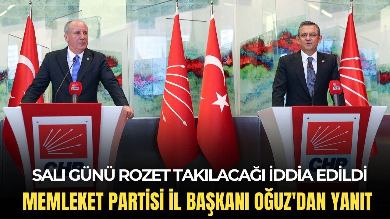 Salı günü rozet takacağı iddialarına yönelik açıklamalarda bulunan Memleket Partisi İzmir İl Başkanı Cüneyt Oğuz, "Salı günü CHP'nin grup toplantısında rozet takacağına ilişkin iddialarle ilgili henüz bir şey yok. Süreç devam ediyor. Son kararı Genel Başkanımız Muharrem İnce verecek. Genel Başkan görüşmelere devam ediyor. 3 hafta önce Parti Meclisinde diğer partilerle görüşme yapma yetkisi verildi. CHP ile yakınlaşma var. Ancak, net bir durum yok. Asıl bilgiyi Genel Başkan önümüzdeki günlerde verecektir. Genel Başkanın görüşmeleri neticesinde parti kurulları da görüşecek" ifadelerine yer verdi.