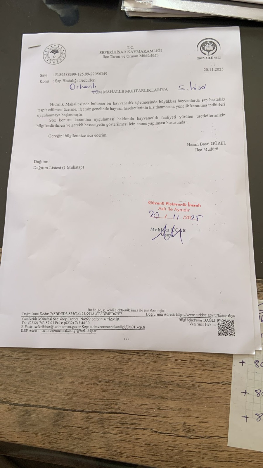 “Seferihisar Hıdırlık Mahallesi’nde bulunan bir hayvancılık işletmesinde büyükbaş hayvanlarda şap hastalığı tespit edilmesi üzerine, ilçemiz genelinde hayvan hareketlerinin kısıtlanmasına yönelik karantina tedbirleri uygulanmaya başlanmıştır. Söz konusu karantina uygulaması hakkında hayvancılık faaliyeti yürüten üreticilerimizin bilgilendirilmesi ve gerekli hassasiyetin gösterilmesi için anons yapılması hususunda gereğini bilgilerinize rica ederim.”