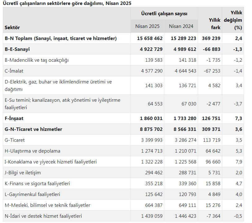 Yıllık bazda sektörler ayrı değerlendirildiğinde, sanayi sektöründe ücretli çalışan sayısının yüzde 1,3 oranında azaldığı görüldü. Buna karşılık inşaat sektöründe yüzde 7,3, ticaret-hizmet sektöründe ise yüzde 3,6 oranında artış kaydedildi.
