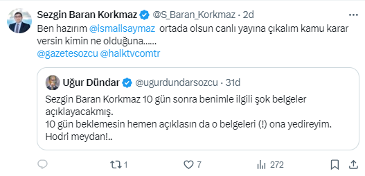 Sezgin Baran Korkmaz'ın hedef aldığı isimler arasında yer alan Uğur Dündar sosyal medya üzerinden Baran'a cevap vererek, ''Sezgin Baran Korkmaz 10 gün sonra benimle ilgili şok belgeler açıklayacakmış. 10 gün beklemesin hemen açıklasın da o belgeleri (!) ona yedireyim. Hodri meydan!.. '' sözleriyle cevap verdi. Sezgin Baran Korkmaz ise Uğur Dündar'ın bu mesajını paylaşarak, İsmail Saymaz'ın hakem olacağı yayın çağrısı yaparak ''Hodri Meydan Uğur Dündar.. Yüreğin yetiyorsa senin kanalında seninle yüzleşmeye hazırım. Sen de hazırsan bu akşam çıkalım birlikte yayına'' çağrısı yaptı.