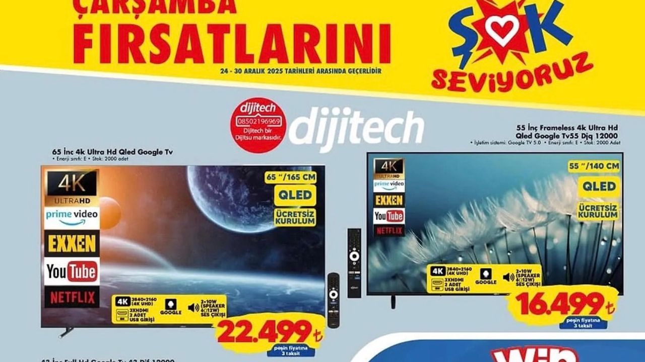 Tüketicilerin yakından takip ettiği Şok 24 Aralık indirimleri, Dijitech, Skytech ve Win markalı akıllı televizyonlarda rekabetçi fiyat etiketleriyle öne çıkıyor. 30 Aralık 2025 tarihine kadar devam edecek kampanya sürecinde, 4K Ultra HD görüntü kalitesine sahip dev ekranlardan, daha kompakt ve bütçe dostu modellere kadar çeşitli ürünler raflarda ve online kanallarda satışa çıkıyor. Peşin fiyatına taksit avantajlarının da bulunduğu listede stok sınırları da belirtildi.
