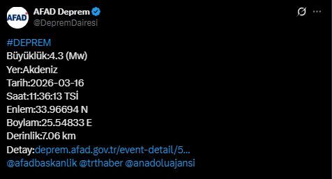 AFAD verilerine göre bugün Akdeniz’de orta şiddette bir deprem kaydedildi.