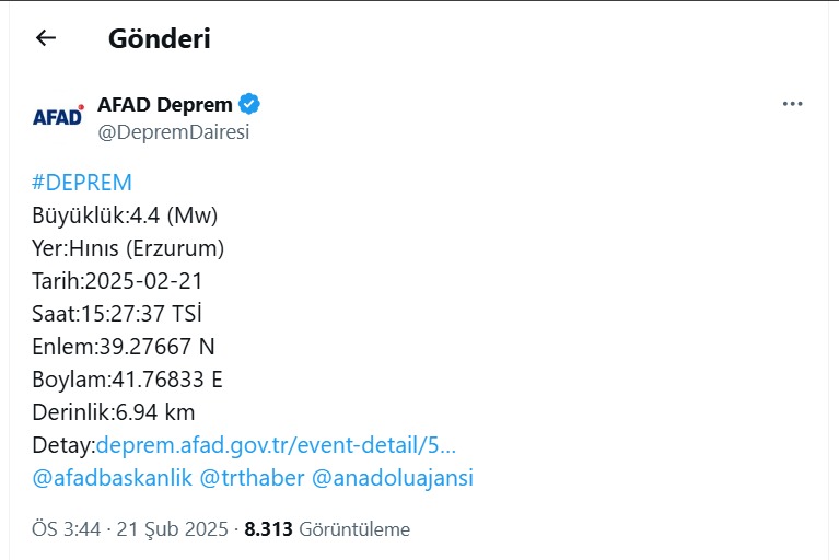 Son Mühür/ Ayşegül Koç- Bugün saat 15.27'de Erzurum'un Hınıs ilçesinde 4.4 büyüklüğünde bir deprem meydana geldi. Kandilli Rasathanesi ve AFAD'ın verilerine göre, deprem yerin 6.94 kilometre derinliğinde gerçekleşti.