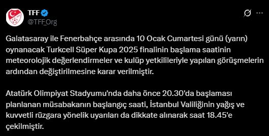 Normal koşullarda 10 Ocak Cumartesi günü saat 20.30’da oynanması planlanan karşılaşmanın başlama saatinde değişikliğe gidildi. Türkiye Futbol Federasyonu (TFF), yaptığı açıklamada; meteorolojik değerlendirmeler ve kulüp yetkilileriyle gerçekleştirilen görüşmeler sonucunda final maçının daha erken bir saatte oynanmasına karar verildiğini duyurdu.