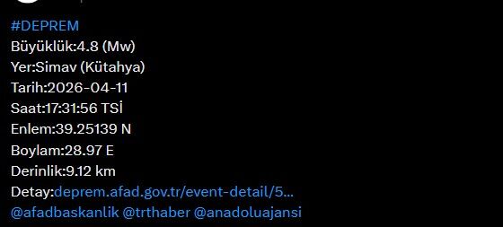 Son Mühür- Afet ve Acil Durum Yönetimi Başkanlığı (AFAD) verilerine göre, merkez üssü Simav olan 4.8 büyüklüğünde bir deprem meydana geldi.
