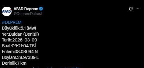 AFAD tarafından paylaşılan bilgilere göre deprem 9 Mart 2026 tarihinde saat 09.21.04’te kaydedildi. Yerin 7 kilometre derinliğinde meydana gelen sarsıntı, özellikle İzmir başta olmak üzere çevre illerde de hissedildi.