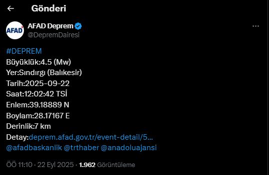 Son Mühür - Balıkesir’in Sındırgı ilçesinde bugün saat 12.02 civarında meydana gelen 4.5 büyüklüğündeki deprem, İzmir’de de hissedildi. Depremin yerin 7 kilometre derinliğinde gerçekleştiği bildirildi.