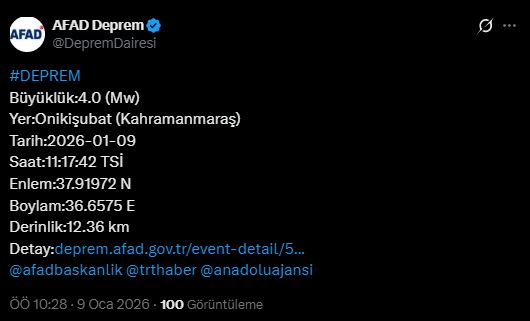 Depremin merkez üssünün Kahramanmaraş’ın Onikişubat ilçesi olduğu bildirildi. Sarsıntı, 9 Ocak 2026 tarihinde saat 11.17’de kaydedildi.