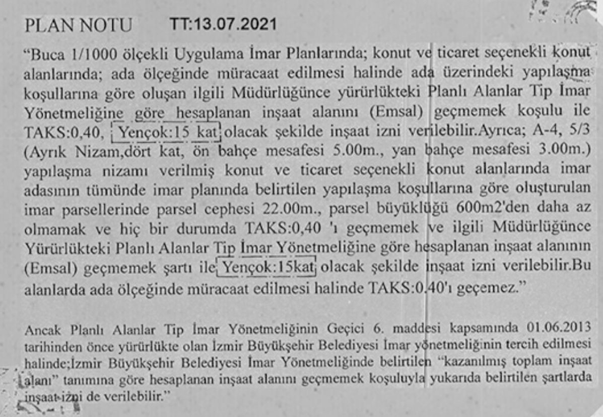 Buca Belediyesi’nin 13 Temmuz 2021 tarihli plan notunda yer alan,