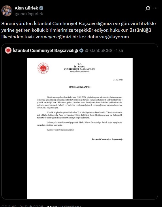 Adalet Bakanı Akın Gürlek, sosyal medya hesabından yaptığı açıklamada, “Süreci yürüten İstanbul Cumhuriyet Başsavcılığımıza ve görevini titizlikle yerine getiren kolluk birimlerimize teşekkür