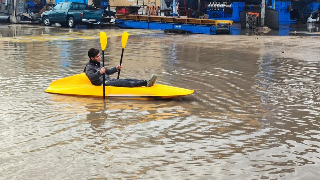 Fiber glas imalathanesinde çalışan Baran Dudukanlı, her yağmur sonrası aynı manzarayla karşılaştıklarını belirterek farklı bir yönteme başvurdu. İmalathanede üretilen kanoyu sokağa çıkaran Dudukanlı, suyla kaplanan yolda kano kullandı.