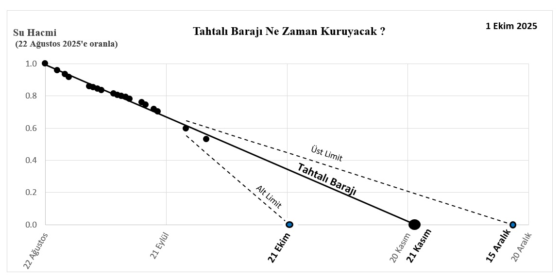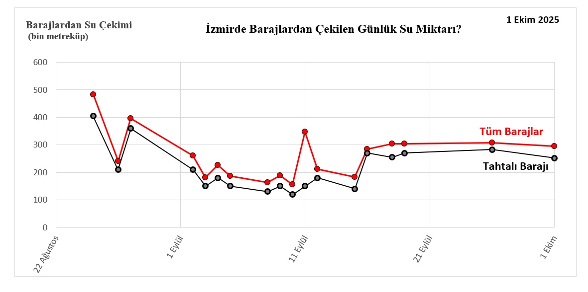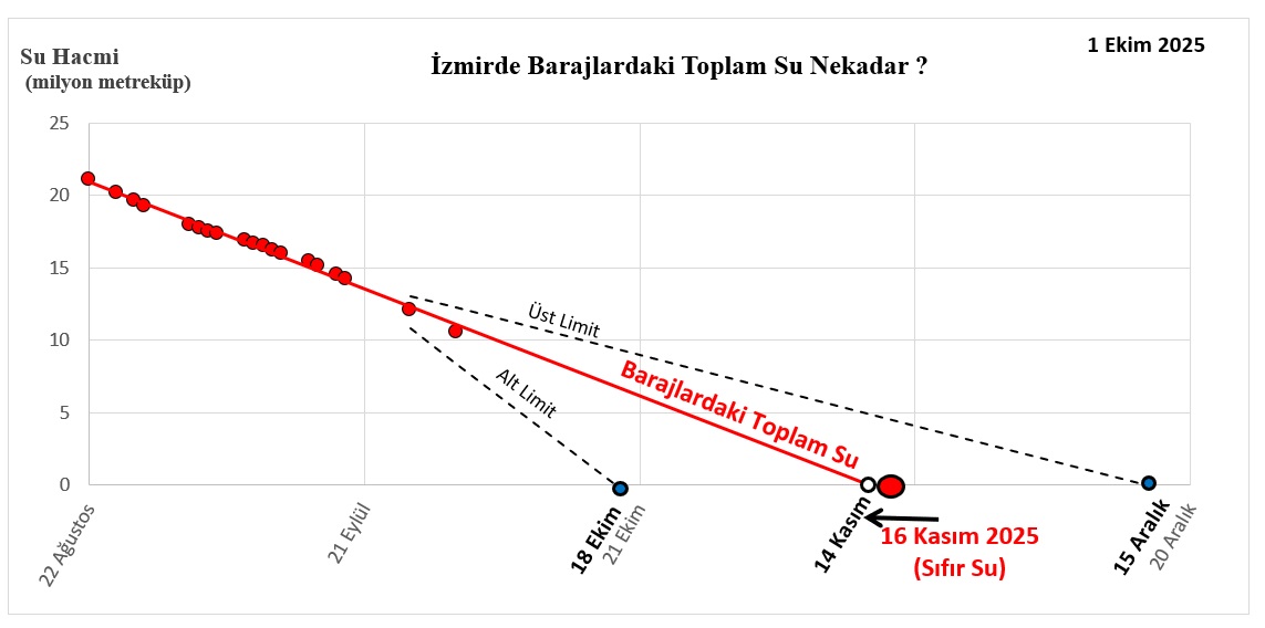 Bu barajlardaki toplam su miktarının bugün itibarıyla 600 bin metreküp olduğunu belirten Özçelik, “Bir başka deyişle, normal su kullanımında tüm İzmir’e ancak 16 saat dayanabilir. Elimizde kalan tek baraj Tahtalı Barajı’ndaki su miktarı ise 9,9 milyon metreküp. Tahtalı Barajı’ndaki su, tek başına normal kullanımda İzmir’e ancak 11 gün yetebilir. Tüm bu barajları, yeraltı su kaynaklarını ve kesintilerle azaltılan su kullanımını beraber düşündüğümüzde İzmir’in 16 Kasım itibariyle aktif rezervuarlar açısından sıfır suya erişeceğini öngörmüştük. Güncel su kullanımları bu tarihin öne geldiğini göstermektedir” ifadelerini kullandı.