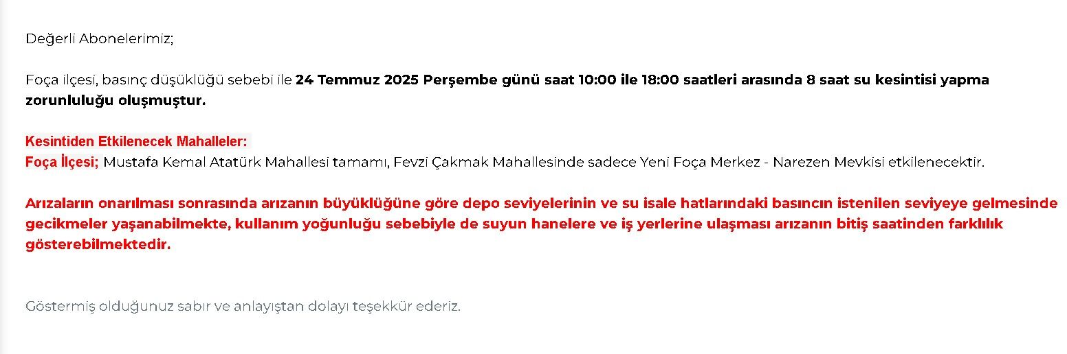 Foça ilçesinde basınç düşüklüğü nedeniyle 24 Temmuz 2025 Perşembe günü saat 10:00 ile 18:00 arasında toplam 8 saatlik su kesintisi uygulanacak.