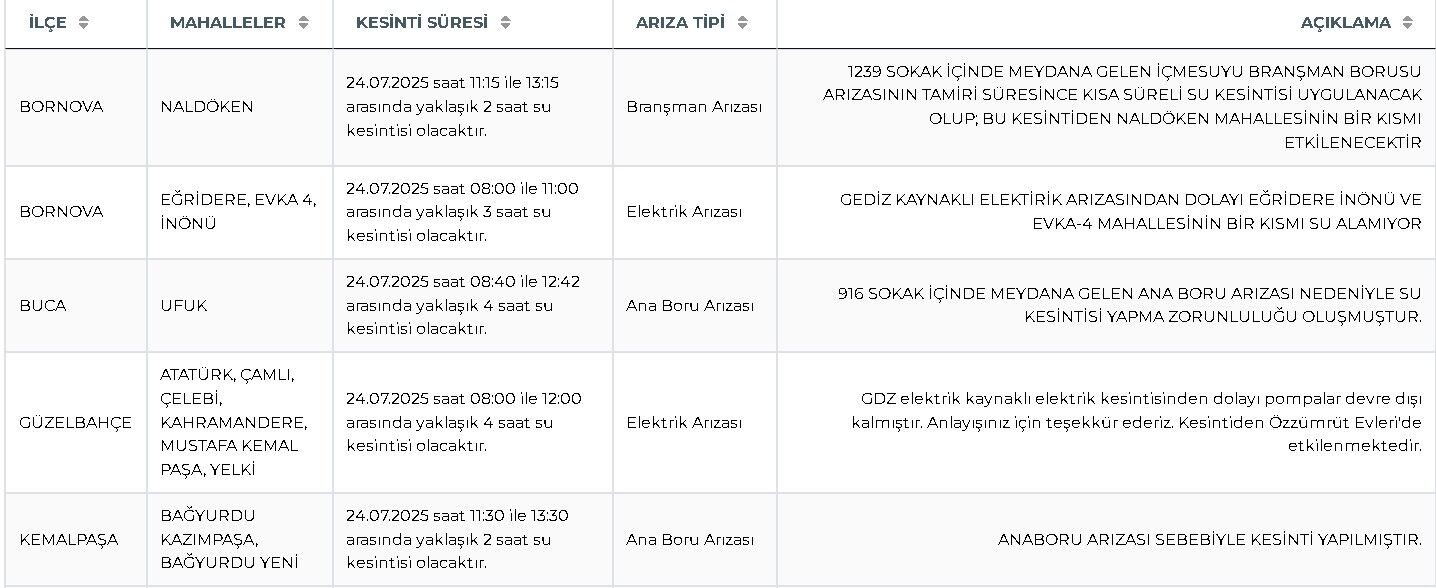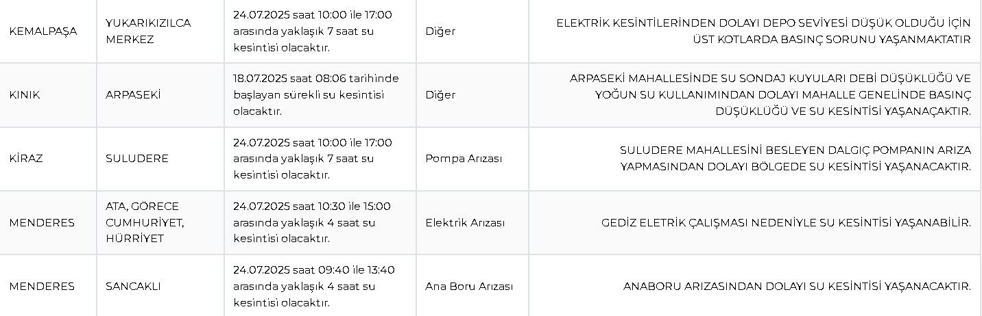 Son Mühür- İzmir genelinde 24 Temmuz 2025 Perşembe günü birçok ilçe ve mahallede arıza, bakım ve basınç düşüklüğü gerekçesiyle su kesintisi yaşanacak. Kesintilerin bazı bölgelerde 8 saate kadar süreceği bildirildi.