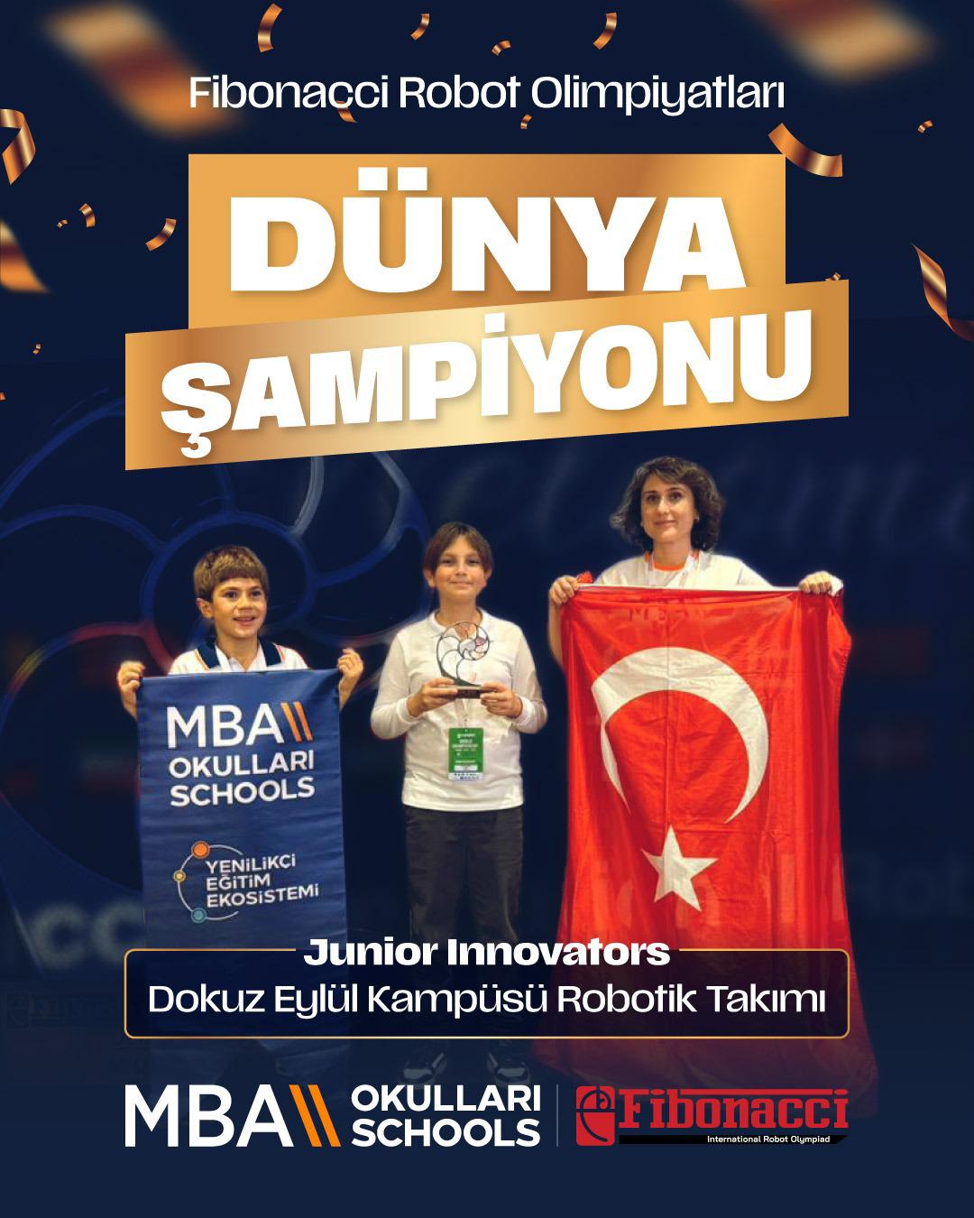 Bir diğer şampiyonluk da Roma'dan geldi. Fibonacci Robot Olimpiyatları'nda Dünya Şampiyonu olarak bizleri gururlandırdılar. 28 ülkenin robotik takımlarının katıldığı yarışmaya, bölge şampiyonalarında dereceye giren ekipler yarıştı. Fibonacci Avrasya Olimpiyatları'nda MBA Okulları Dokuz Eylül Kampüsü Robotik Takımı Junıor İnnovators, Dünya Şampiyonu oldu. Gençleri kutluyorum.