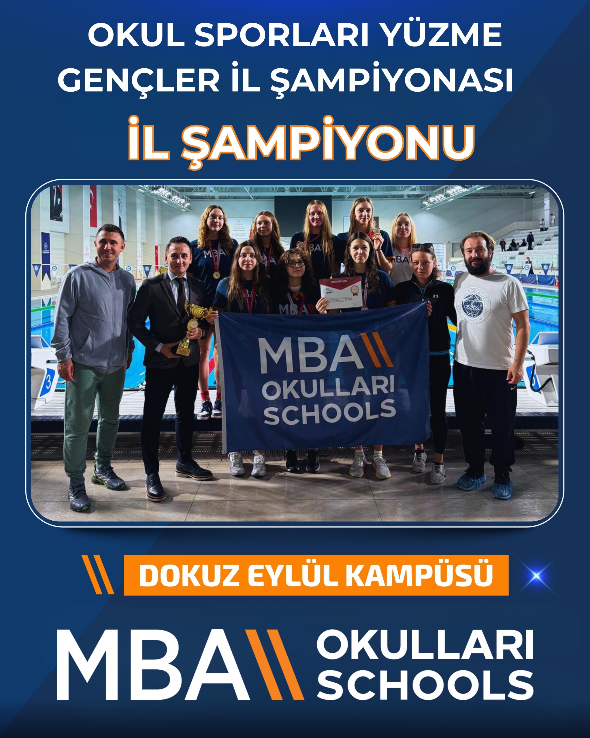 Geçen sene Türkiye Şampiyonu olan, MBA yüzme takımı bu yılda İzmir İl Şampiyonu oldu. Okul Sporları Yüzme Gençler İl Şampiyonası'nda hem kadınlar hem de erkeklerde kazanmışlar. Şimde bölge ve Türkiye Şampiyonluğu sırada...