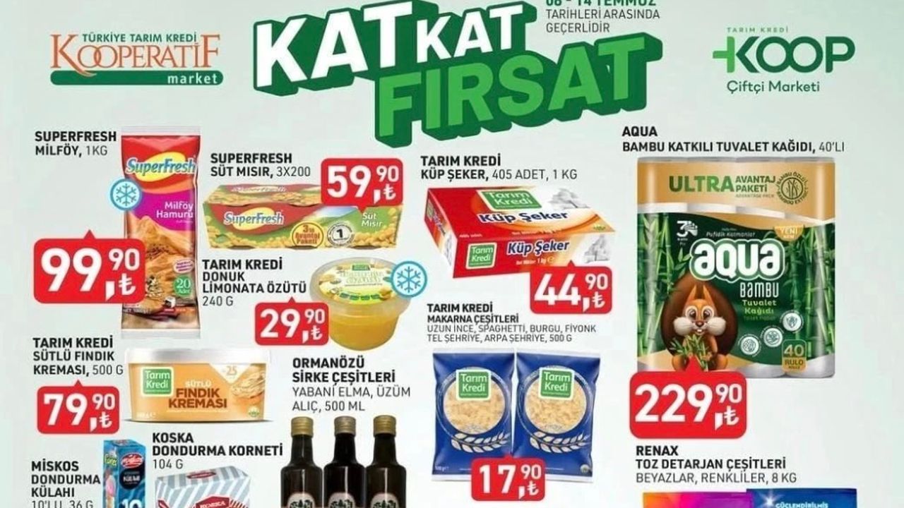 Türkiye Tarım Kredi Kooperatifleri’ne bağlı Çiftçi Marketleri, her hafta sunduğu indirimlerle tüketicilerin yüzünü güldürmeye devam ediyor. 8-14 Temmuz tarihleri arasında geçerli olacak “Kat Kat Fırsat Kataloğu” yayımlandı ve özellikle yağ çeşitlerinde dikkat çekici indirimler öne çıktı. Temel gıda ürünlerinden temizlik malzemelerine, atıştırmalıklardan kişisel bakım ürünlerine kadar geniş bir yelpazede indirimli ürünler, bu hafta raflarda yerini alıyor. Katalog, hem kalite hem de uygun fiyat arayanlar için cazip fırsatlar sunuyor.