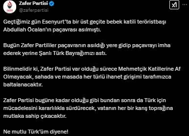 “Geçtiğimiz gün Esenyurt’ta bir üst geçite bebek katili teröristbaşı Abdullah Öcalan’ın paçavrası asılmıştı. Zafer Partililer paçavranın asıldığı yere gidip paçavrayı imha ederek yerine Şanlı Türk Bayrağımızı astı. Bilinmelidir ki, Zafer Partisi var olduğu sürece Mehmetçik Katillerine Af Olmayacak, sahada ve masada her türlü ihanet girişimi tarafımızca baltalanacaktır. Zafer Partisi bugüne kadar olduğu gibi bundan sonra da Türk için mücadelesini kararlılıkla sürdürecek, vatanın her bir karış toprağına mutlaka sahip çıkacaktır. Ne mutlu Türk’üm diyene!”