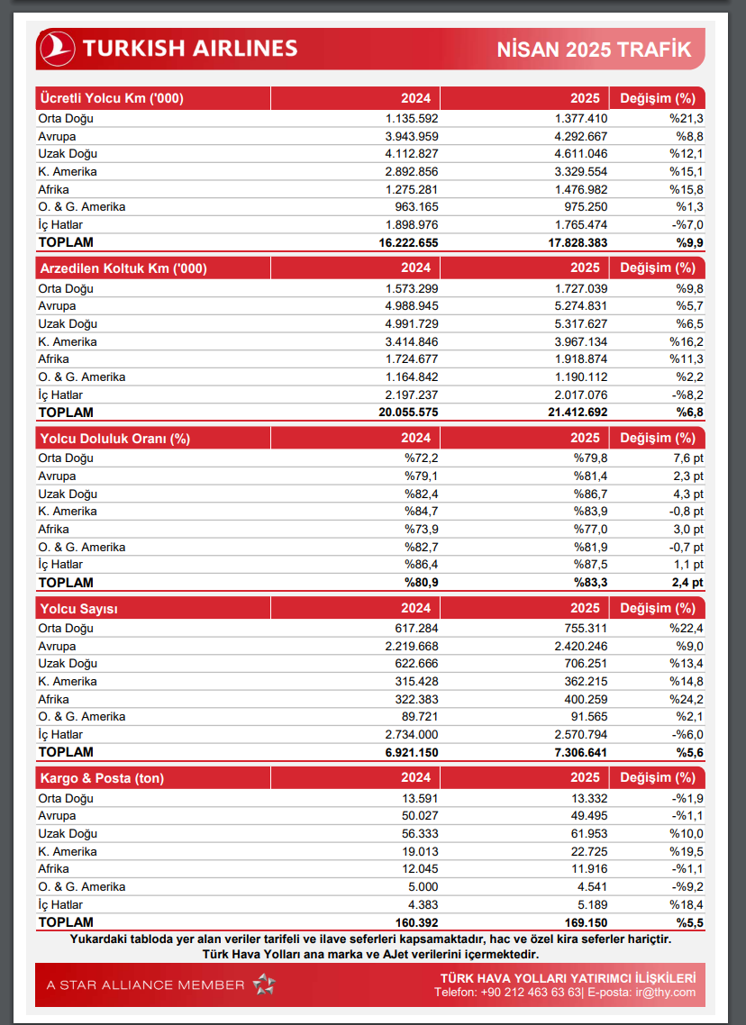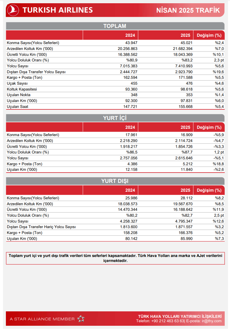 2025 yılı Ocak-Nisan dönemine ilişkin trafik verileri de şirketin büyüme trendini sürdürdüğünü ortaya koydu. Bu dört aylık süreçte toplam 26,3 milyon yolcu taşındı, bu rakam 2024'ün aynı döneminde 25,5 milyondu. Yani yıllık bazda %3,3’lük bir artış gerçekleşti.