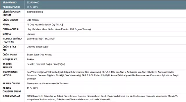 Bakanlık, L'actone markasına ait "Sweet Sugar" ve "Melon" isimli oda kokularının kesiklere neden olabilecek yapıda olduğunu ve kimyasal ile sağlık açısından risk taşıdığını açıkladı: