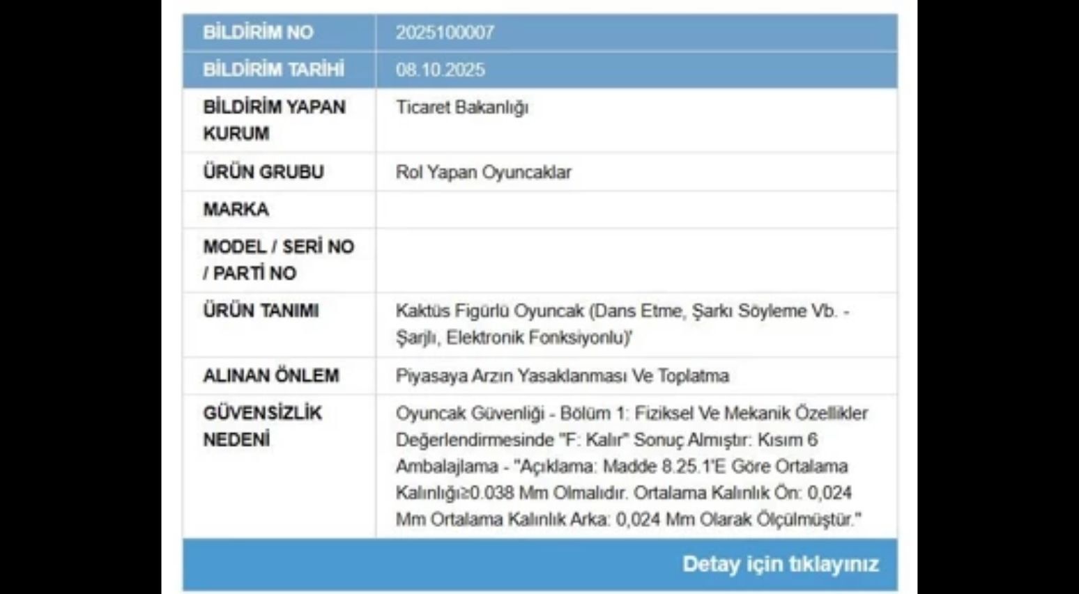 Bakanlık yetkilileri, ürünlerde yapılan teknik incelemeler sonucunda ciddi güvenlik ve etiketleme ihlalleri saptandığını bildirdi. İlk ürün olan “Rol Yapan Oyuncaklar Enis Çelebi Ennes Yeni Nesil Teknoloji Kaktüs Figürlü Oyuncak” (dans etme, şarkı söyleme gibi elektronik fonksiyonlara sahip, şarjlı) üzerinde yapılan testler, mekanik ve fiziksel güvenlik açısından standartlara uymadığını gösterdi.