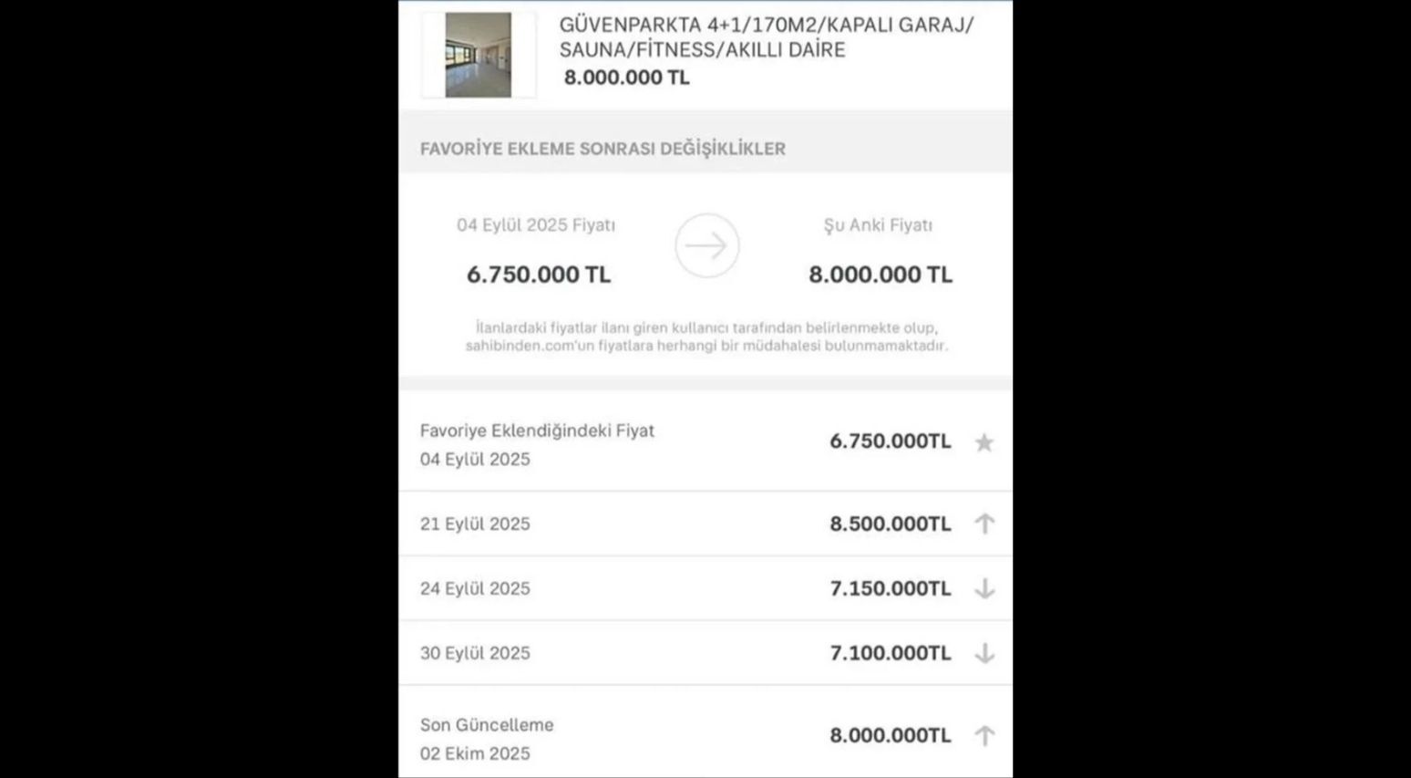 Kaplan'ın verdiği bilgiye göre, söz konusu evin fiyatı 1 Eylül 2025’te 6 milyon 750 bin TL iken, 2 Ekim 2025’te 8 milyon TL’ye yükseltildi.