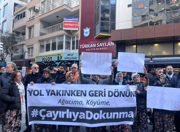 Son Mühür/ Gamze Eskiköy- İzmir’in Tire ilçesine bağlı Çayırlı Köyü’nde acele kamulaştırma kararıyla başlayan ağaç kesimleri, köylülerin sert tepkisiyle karşılanmaya devam ediyor. Geçim kaynakları olan zeytin ve incir ağaçlarını korumak için mücadele eden köylüler, geçtiğimiz günlerde iş makinelerinin önüne geçerek kesimlere engel olmuştu. Bugün ise seslerini İzmir’den duyurmak için Türkan Saylan Kültür Merkezi önünde bir araya gelen köylüler, yetkililere seslendi.