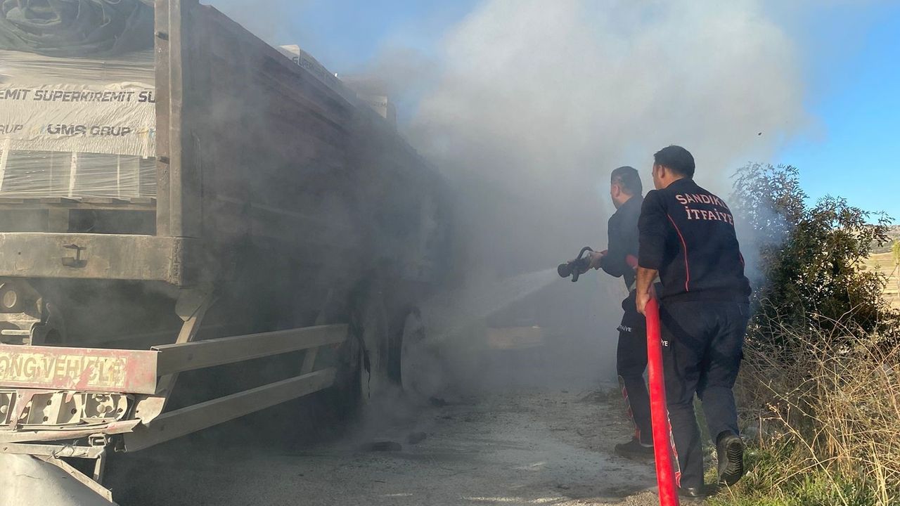 Afyonkarahisar’ın Sandıklı ilçesinde seyir halindeki tırın dorsesindeki lastikler alev aldı. İtfaiyenin hızlı müdahalesi ve vatandaşların desteğiyle yangın kısa sürede kontrol altına alındı.