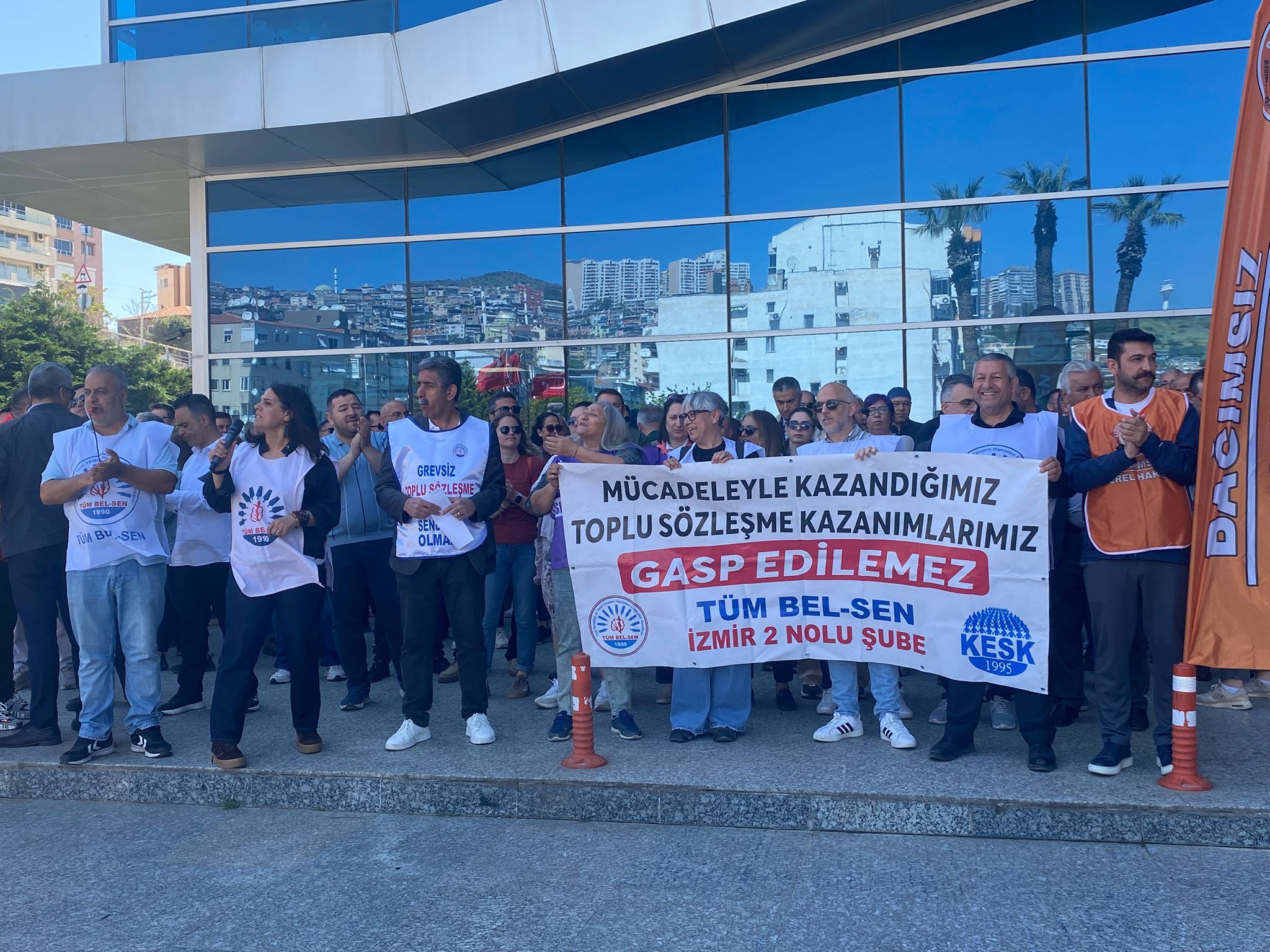 Son Mühür/ Emine Kulak- İzmir’in Bayraklı ilçesinde belediye ile Tüm Bel Sen İzmir 2 No’lu Şube arasında yürütülen Toplu İş Sözleşmelerinde uzlaşma sağlanamadığı için 13 Nisan pazartesi günü başlatılan eylem 15.gününde devam ediyor.