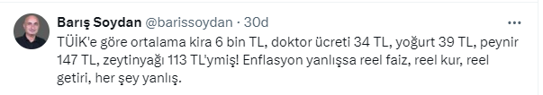 Alaattin Aktaş'ın açıkladığı TÜİK rakamlarına göndermede bulunan ekonomist Barış Soydan tepkisini, 'TÜİK'e göre ortalama kira 6 bin TL, doktor ücreti 34 TL, yoğurt 39 TL, peynir 147 TL, zeytinyağı 113 TL'ymiş! Enflasyon yanlışsa reel faiz, reel kur, reel getiri, her şey yanlış' sözleriyle ifade etti.