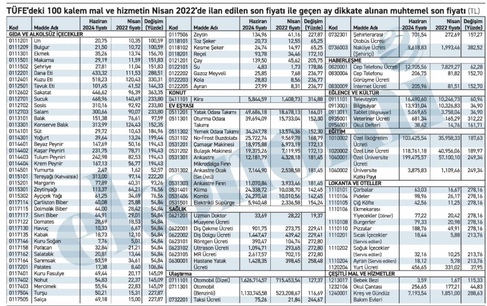 TÜFE hesabı bu rakamlara göre yapılıyor...