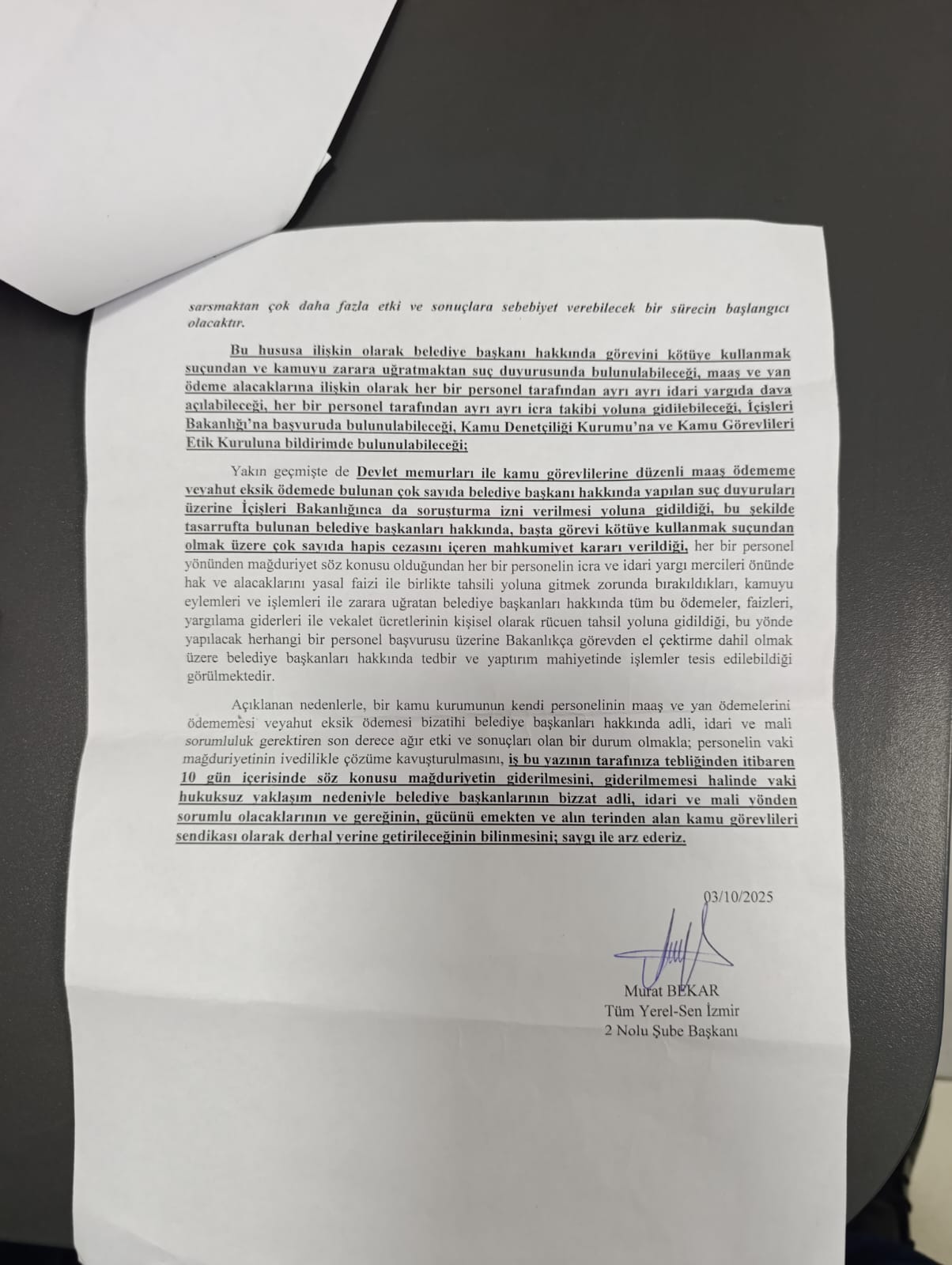 Sendika, belediyeye verilen dilekçeyle 10 günlük süre tanındığını bu süre içinde tazminatlar ödenmezse şunların uygulanacağını açıkladı: