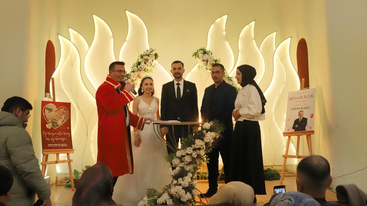 Nikah Salonu’nda yer alan süslemelerle 14 Şubat’a özel bir hava yaratıldı. Her detayıyla özenle hazırlanan alan, çiftlere unutulmaz bir anı sunmayı amaçladı. Çiftlerin girişine renk katan canlı müzik dinletisi, ortamın romantizmini pekiştirdi. Bu özel günde hayatlarını birleştiren çiftler ve aileleri, Turgutlu Belediyesi’nin sunduğu sürpriz karşısında büyük bir mutluluk yaşadılar.