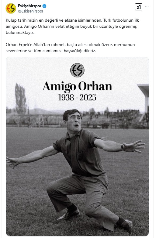 "Kulüp tarihimizin en değerli ve efsane isimlerinden, Türk futbolunun ilk amigosu, Amigo Orhan’ın vefat ettiğini büyük bir üzüntüyle öğrenmiş bulunmaktayız. Orhan Erpek’e Allah’tan rahmet, başta ailesi olmak üzere, merhumun sevenlerine ve tüm camiamıza başsağlığı dileriz." ifadelerine yer verilen açıklama, Eskişehirspor taraftarlarını derinden sarstı.