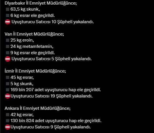 Son Mühür/Merve Turan- İçişleri Bakanı Ali Yerlikaya, Emniyet Genel Müdürlüğü ve Jandarma Genel Komutanlığı tarafından son üç haftada gerçekleştirilen geniş çaplı yasaklı madde operasyonlarının sonuçlarını kamuoyuyla paylaştı. Bakan Yerlikaya’nın açıklamasına göre, 78 ilde düzenlenen operasyonlarda toplam 1 ton 806 kg yasaklı madde ve 8 milyon 437 bin uyarıcı madde ele geçirildi.
