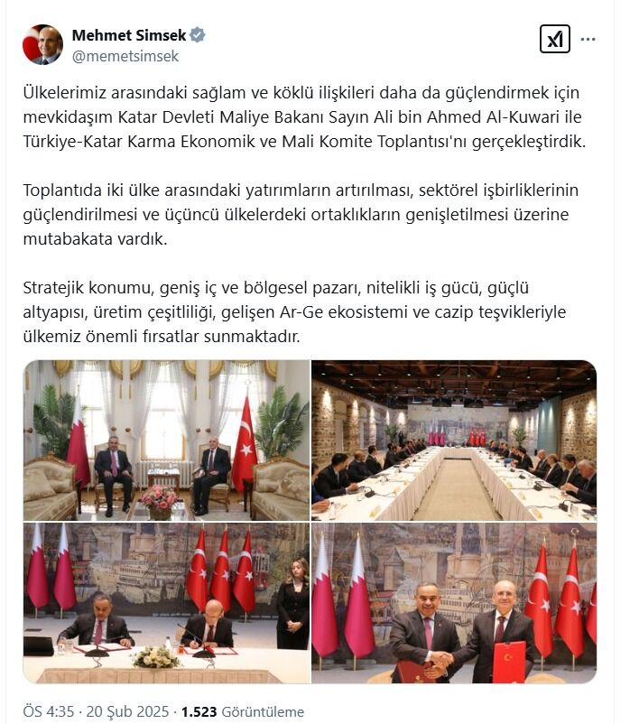 Son Mühür/ Merve Turan- Hazine ve Maliye Bakanı Mehmet Şimşek, Türkiye-Katar Karma Ekonomik ve Mali Komite Toplantısı kapsamında iki ülke arasında yatırımların sürdürülebilirliğinin sürdürüldüğü, sektörel işlerin birleştiği ve üçüncü yılda ortaklaşa çalıştırıldığı konusunda mutabakata varıldığı belirtildi.