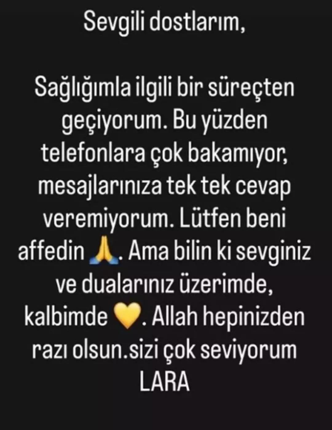 “Sağlığımla ilgili bir süreçten geçiyorum. Bu yüzden telefonlara çok bakamıyor, mesajlarınıza tek tek cevap veremiyorum. Lütfen beni affedin. Ama bilin ki sevginiz ve dualarınız üzerimde, kalbimde. Allah hepinizden razı olsun. Sizi çok seviyorum.”