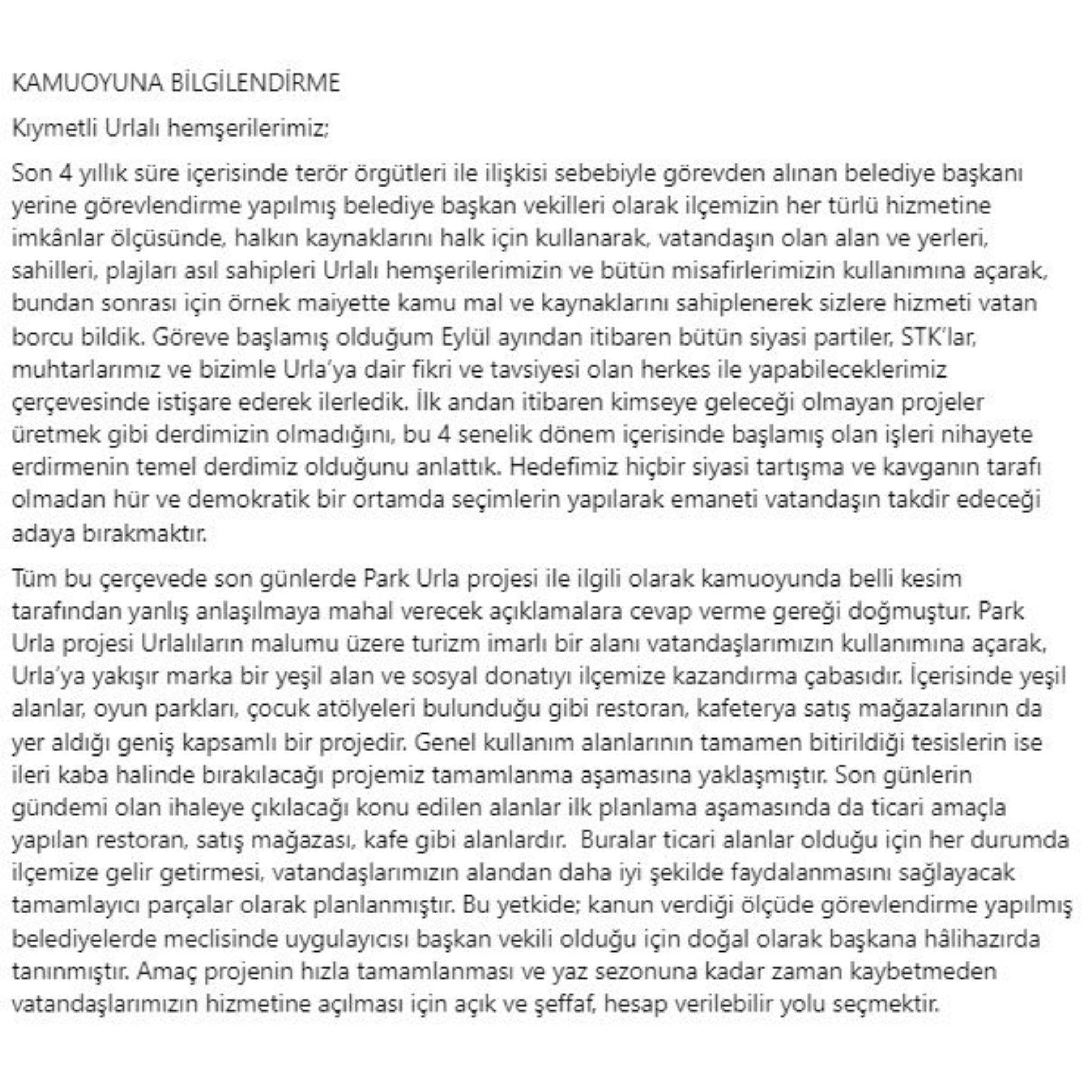 Urla Kaymakamı ve Başkan Vekili Mustafa Gözlet’in ‘Park Urla’ projesindeki taşınmazlar için aldığı ihale kararı kamuoyunda tartışılmaya devam ediyor. Belediye başkan aday adayları duruma tepki gösterirken Gözlet yazılı bir açıklamayla ihalenin konu alanların ticari amaçla yapılan restoran, satış mağazası, kafe gibi yapıların olduğunu belirtti. Amacının mal kaçırmak olmadığını ifade eden Gözlet “. Amacımız kimseden mal kaçırmak değildir. Kaldı ki; seçimden sonra bu ilçenin kaymakamı olarak görevimiz devam edecek olup niyetimiz seçilecek başkan kim olursa onunla, ilçemiz siyasi partileri ve STK’ları ile istişare halinde olarak ilçemize kazandırabileceğimiz tüm hizmet ve yatırımları kazandırmaktır” mesajı verdi.