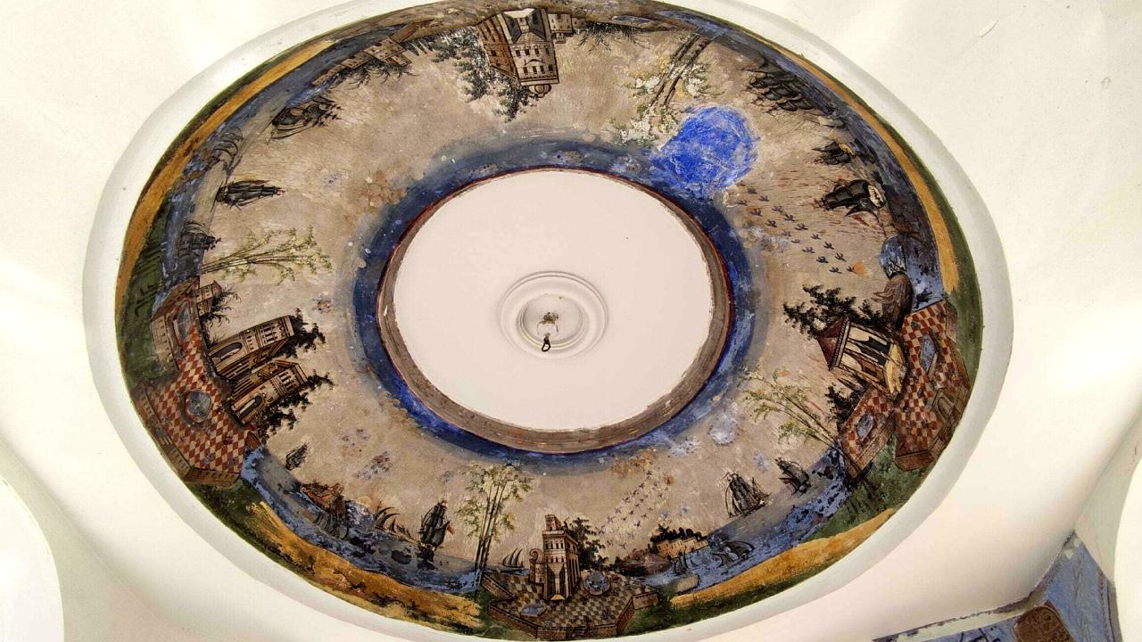 Şadırvanın iç kubbesi, manzara, yapı ve gemi tasvirlerinden oluşan duvar resimleriyle süslenmiş durumda bulunuyor. Duvar resimlerinde masmavi deniz üzerinde yelkenli gemiler, gerçekçi biçimde betimlenmiş ağaçlar ve perspektif uyumsuzluklarıyla öne çıkan konaklar yer alıyor. Gruplar halinde uçan kuşlar, bulutlar ile ışık ve gölge etkileri dikkat çekiyor.