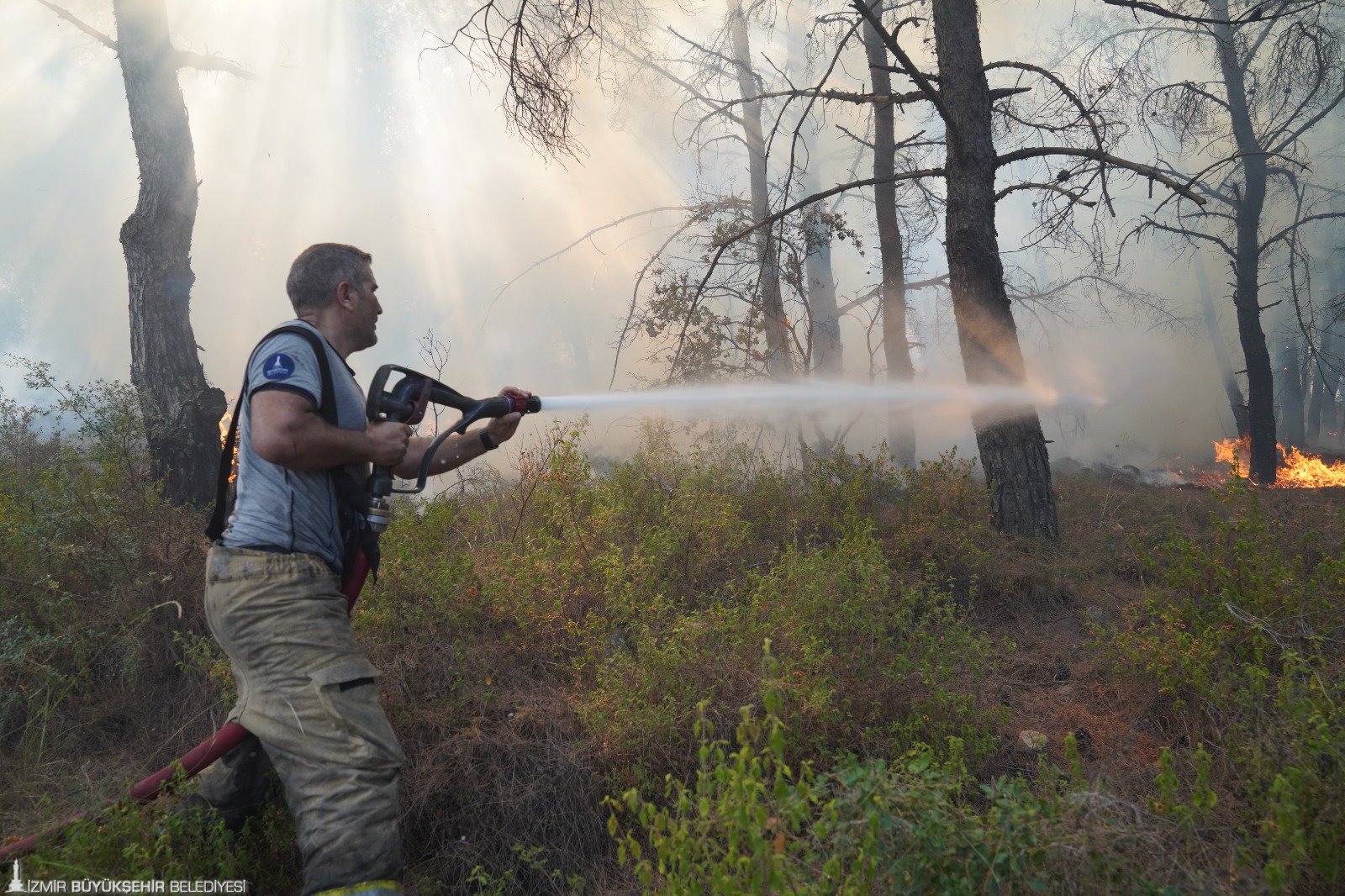 İlk belirlemeye göre kaynak makinesinden çıktığı tahmin edilen yangında can ve mal kaybının olmadığını söyleyen İzmir Büyükşehir Belediyesi İtfaiye Dairesi Başkanı İsmail Derse, “Bölgede arazi engebeli. Bu da müdahale etkisini ve hızını yavaşlatıyor. Rüzgar da alevlerin sıçramasını kolaylaştırıyor. Biz burada 100'ün üzerinde ekip ve 25 araçla söndürme çalışmalarına katıldık” dedi.