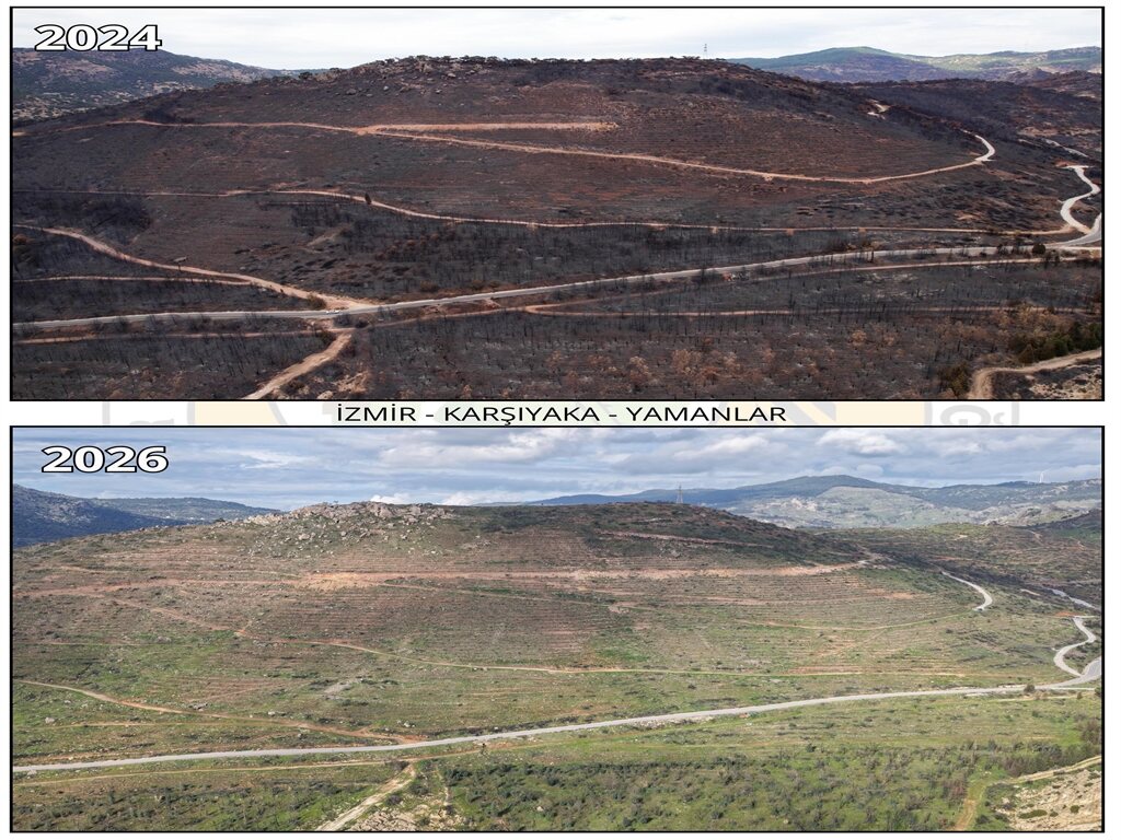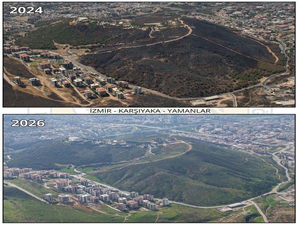 İzmir’in Karşıyaka ilçesinde bulunan Yamanlar Dağı’nda 2024 yılında meydana gelen orman yangınının ardından yürütülen rehabilitasyon çalışmaları sonuç vermeye başladı. Alevlerden zarar gören alanlarda doğal ve yapay yenilenme süreciyle birlikte yeşil doku yeniden oluşuyor.